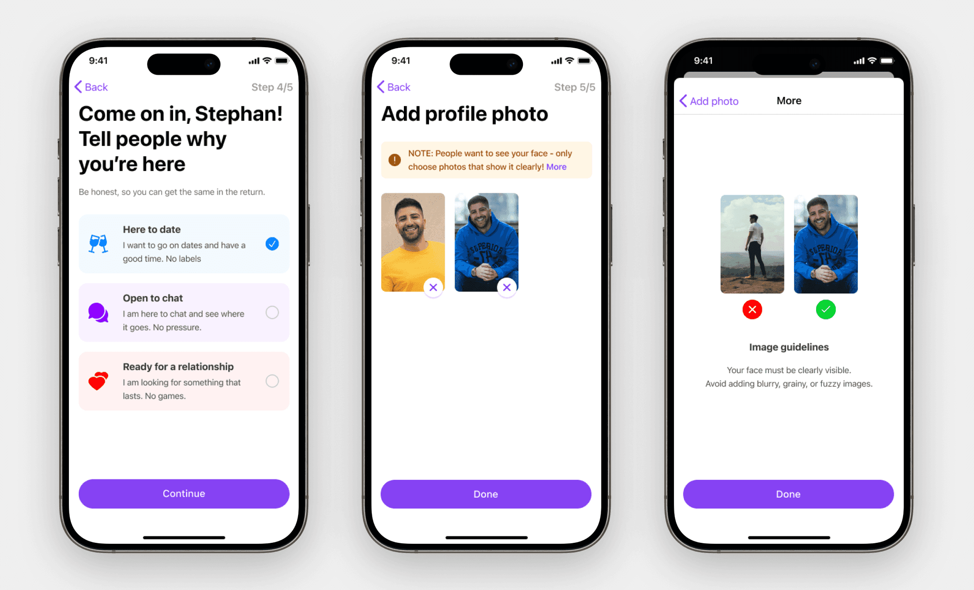I created a step-by-step onboarding that breaks sign-up into 5 simple screens: account creation, identity, profile details, intent, and photo upload. This flow balances ease of use with clear guidance, builds trust from the start. Early tests showed this reduced user confusion and improved profile quality, put down a stronger foundation for meaningful matches.