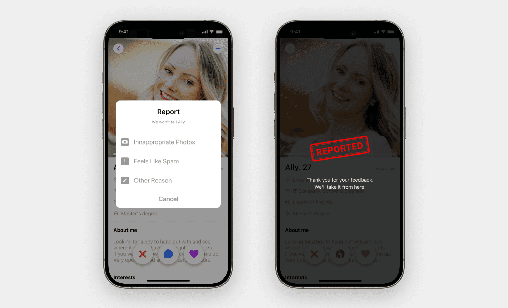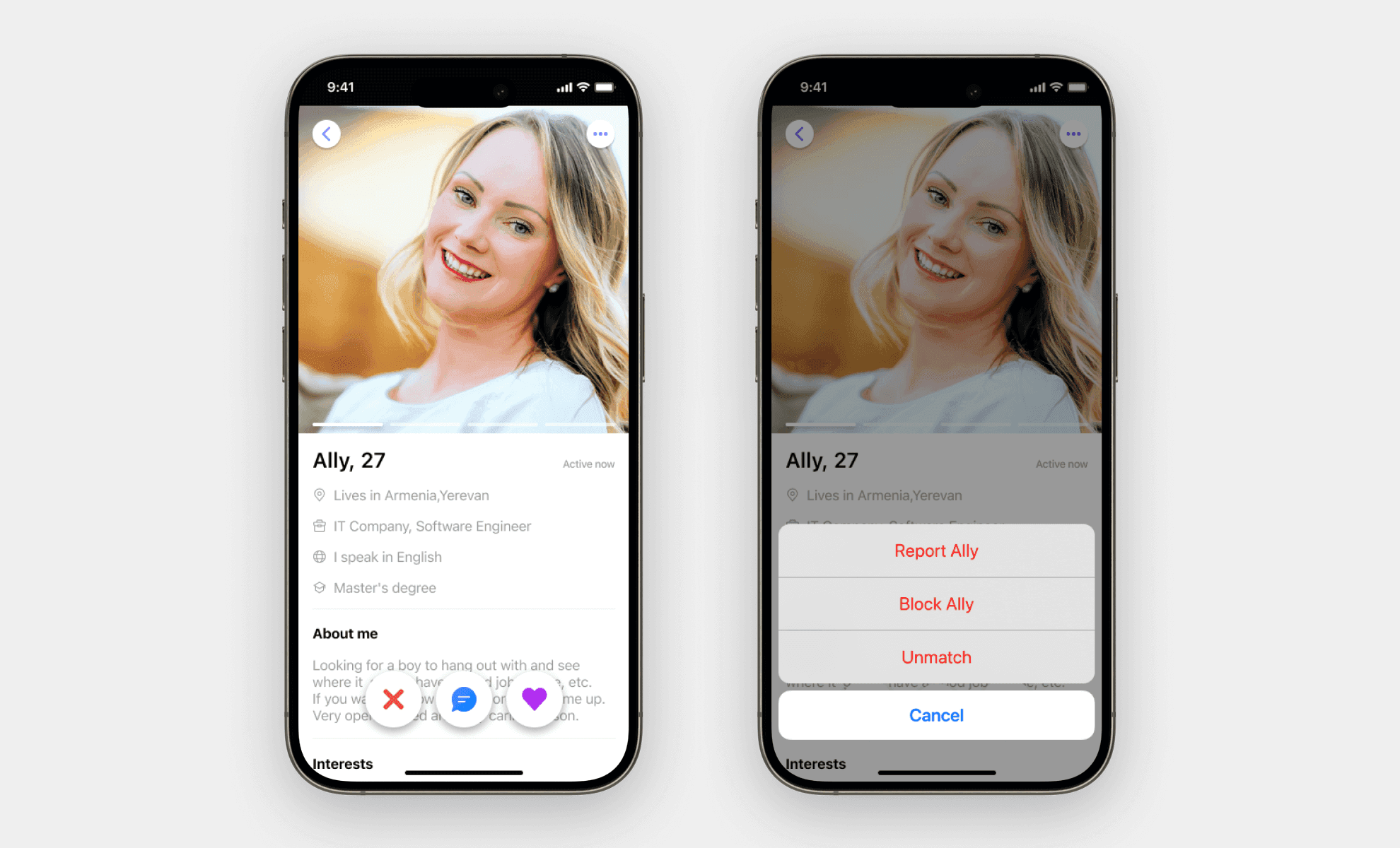 To build trust and create a safer dating environment, we prioritized user safety by giving people full control over their interactions. I designed an action menu that allows users to report, block, or unmatch anyone at any time, directly from their profile.