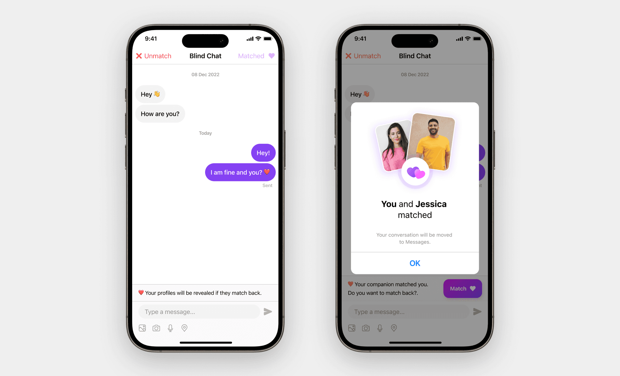 Users can enter a blind conversation once per day, without seeing the other person’s profile. They can freely chat, and at any time choose to “Match” or “Unmatch.” If both users match, their profiles are revealed and the conversation moves to the regular messages tab. If not, the chat disappears after 24 hours.