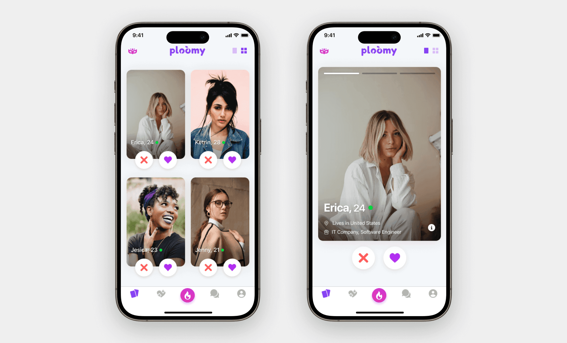 To make the engaging matching process, I designed two different ways for users to discover profiles "Grid" and "One Card" view. The "Grid" view gives users more choice and freedom to explore multiple matches at once, while the "One Card" view keeps the swipe interaction people expect in dating apps.